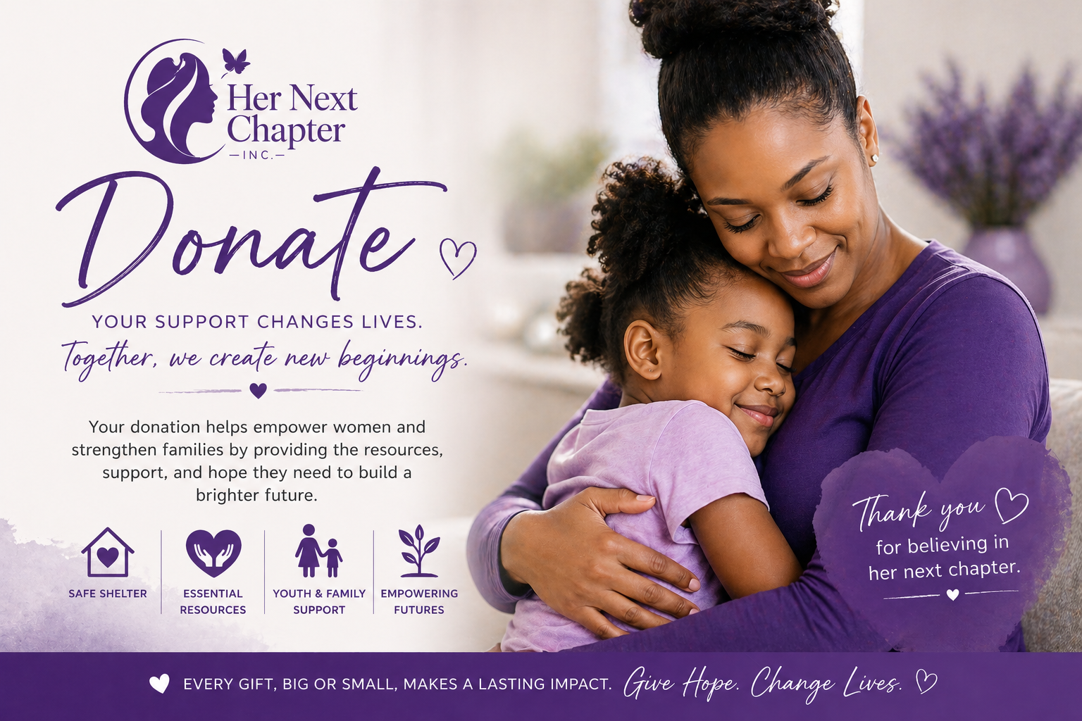 Your donation supports Her Next Chapter Inc. programs that provide domestic violence support, food and clothing assistance, school supplies, family outreach services, and resources that help women, children, and families build brighter futures.